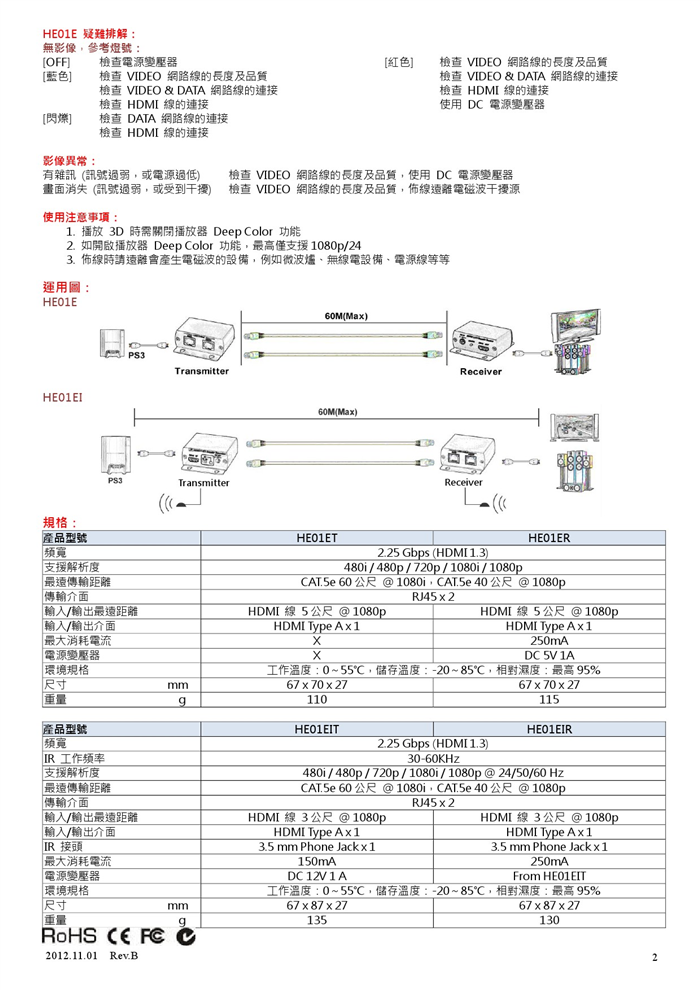 採用兩條CAT.5e或CAT 6網路線傳輸,傳輸距離最遠可達到60公尺