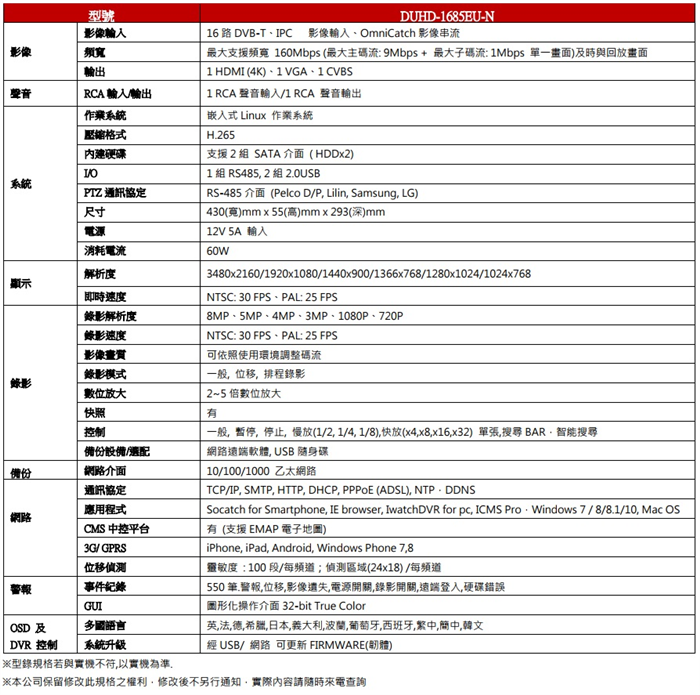 • DUHD-1685EU-N 可取 iCATCH DUHD 4K DVR H.265 16CH Digital DVR 專用錄影主機