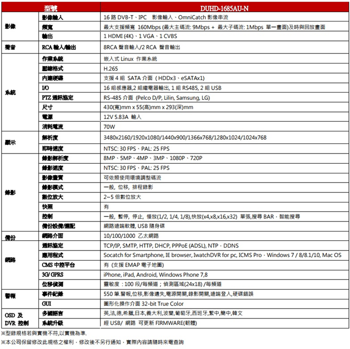• DUHD-1685AU-N 可取 iCATCH DUHD 4K DVR H.265 16CH Digital DVR 專用錄影主機