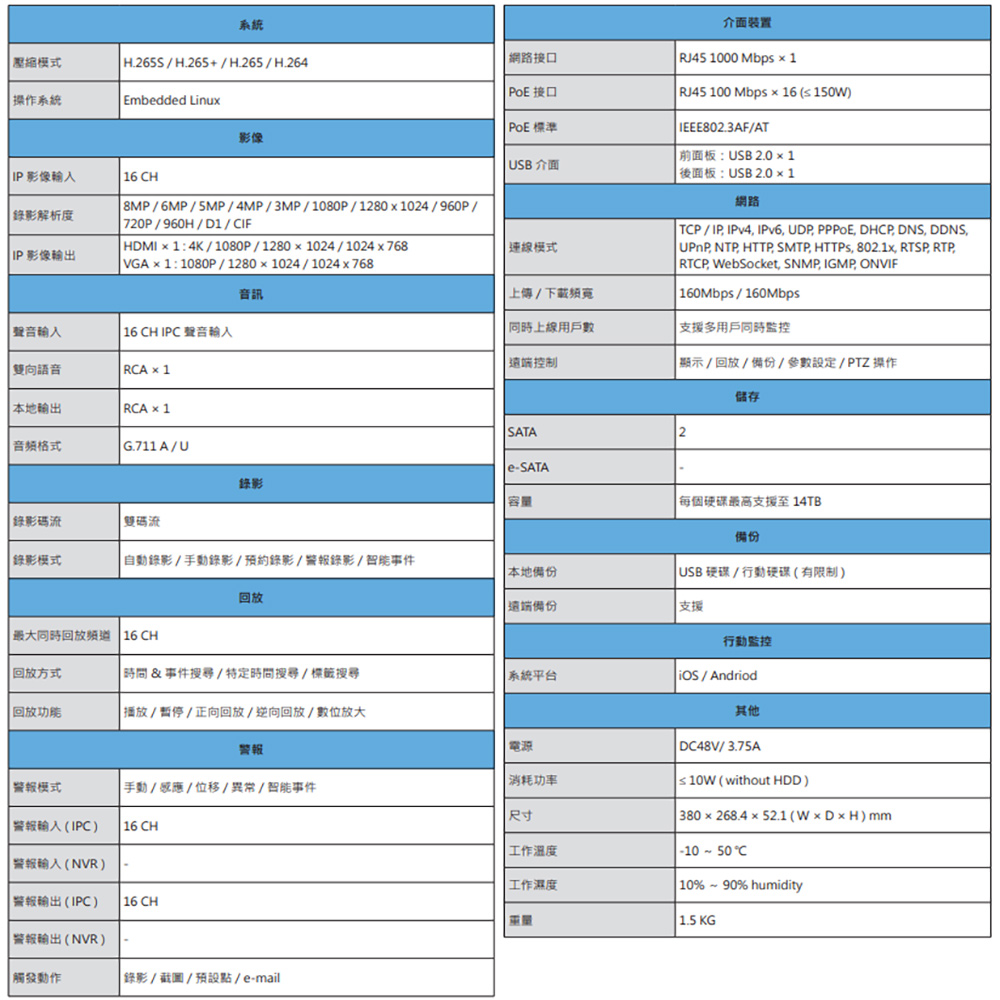 -支援 16CH 回放 1 / 4 / 9 / 16 CH