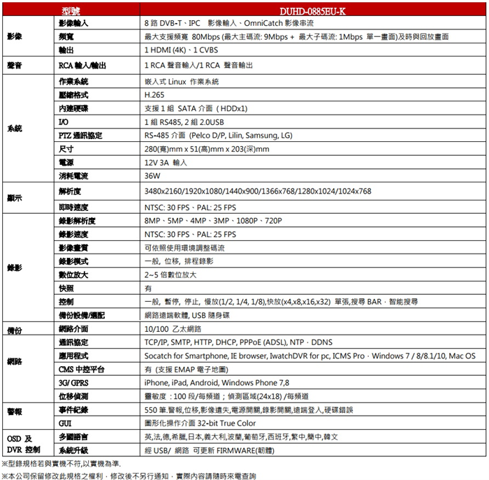 • DUHD-0885EU-K 可取 iCATCH DUHD 4K DVR 8CH 數位錄影主機