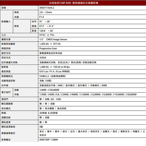 雙影像輸出: AHD 720P或類比1280H
