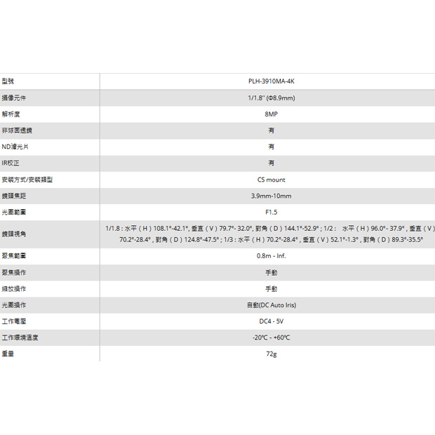 LILIN 利凌 PLH-3910MA-4K 3.9-10mm, 8MP 鏡頭