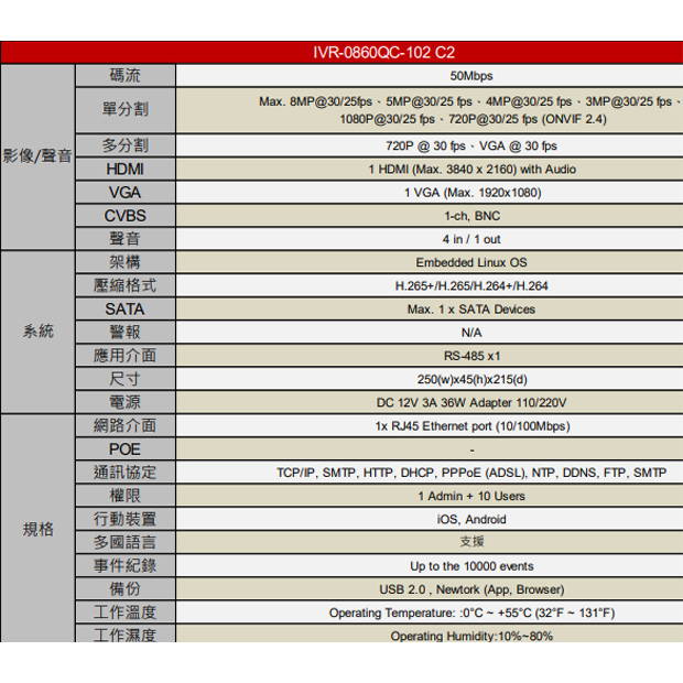 ICATCH可取 IVR-0860QC-102 C2 1080P 8路 H.265 網路錄影主機