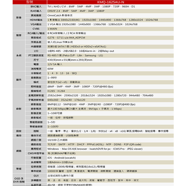 支援8MP AHD/TVI/CVI、960H/D1、IPcam 各式攝影機訊號,攝影機影像可隨意更換。