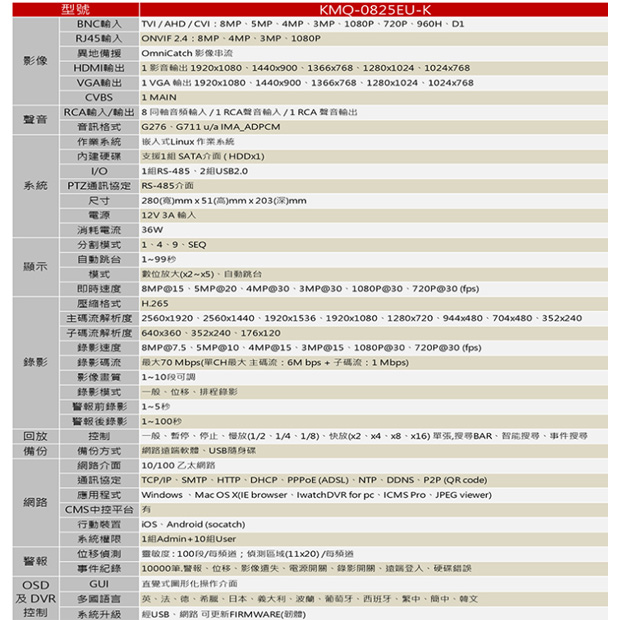 支援8MP AHD/TVI/CVI、960H/D1、IPcam 各式攝影機訊號,攝影機影像可隨意更換。
