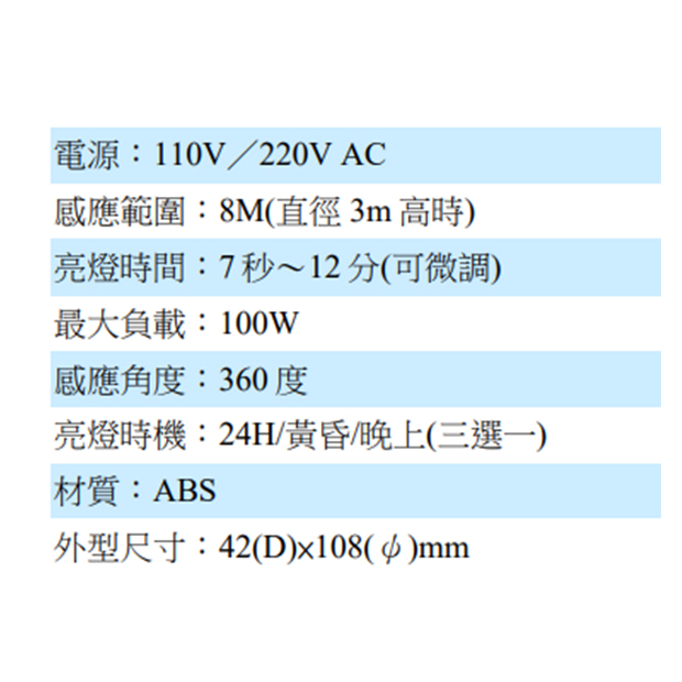 感應範圍:8M(直徑3m高時),感應角度:360度