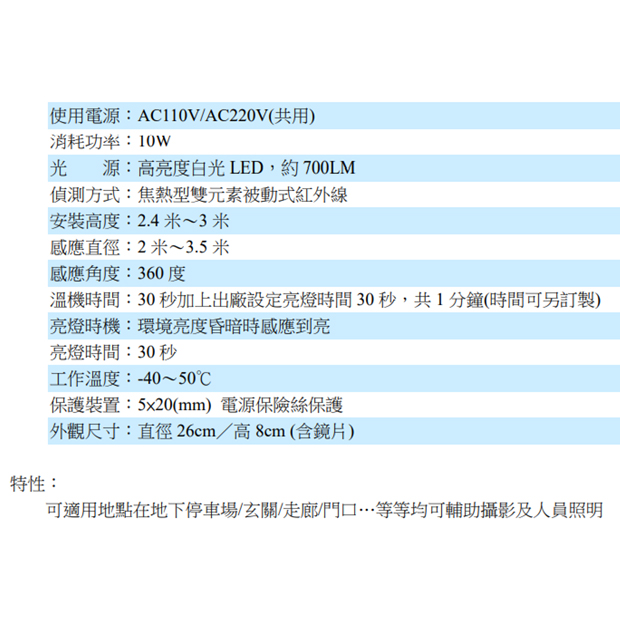 亮燈時機:環境亮度昏暗時感應到亮,亮燈時間:30秒