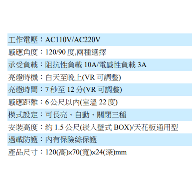 亮燈時間:7秒至12分(VR可調整)