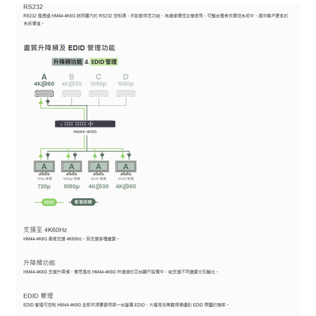 HM44-4K6G 4K60Hz 4x4 HDMI 無縫矩陣切換器(支援電視牆與多畫面功能)