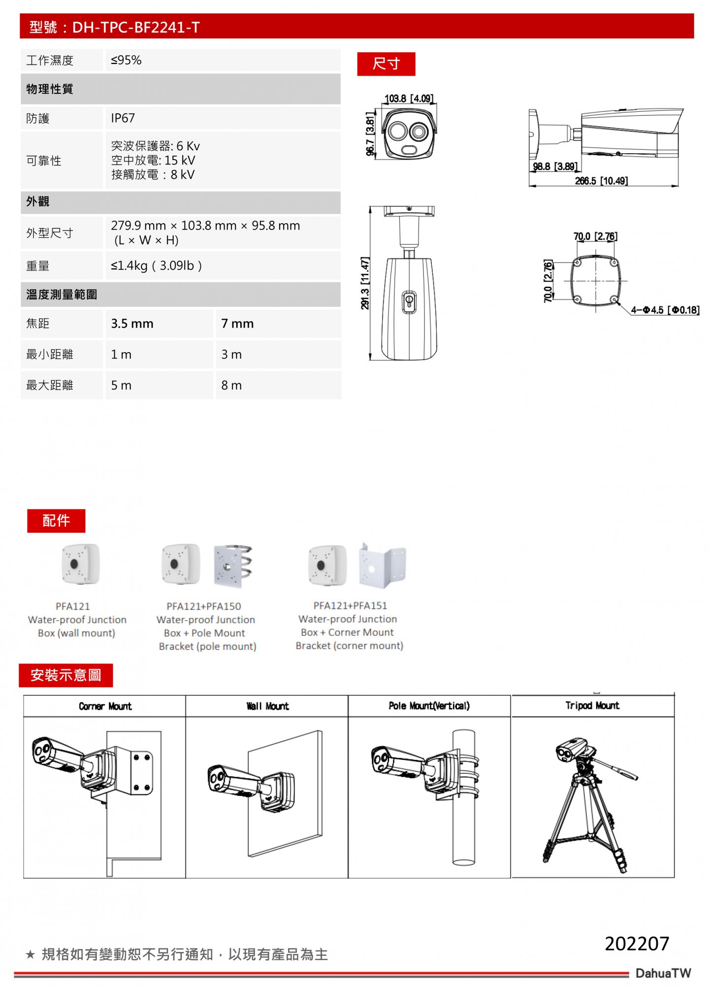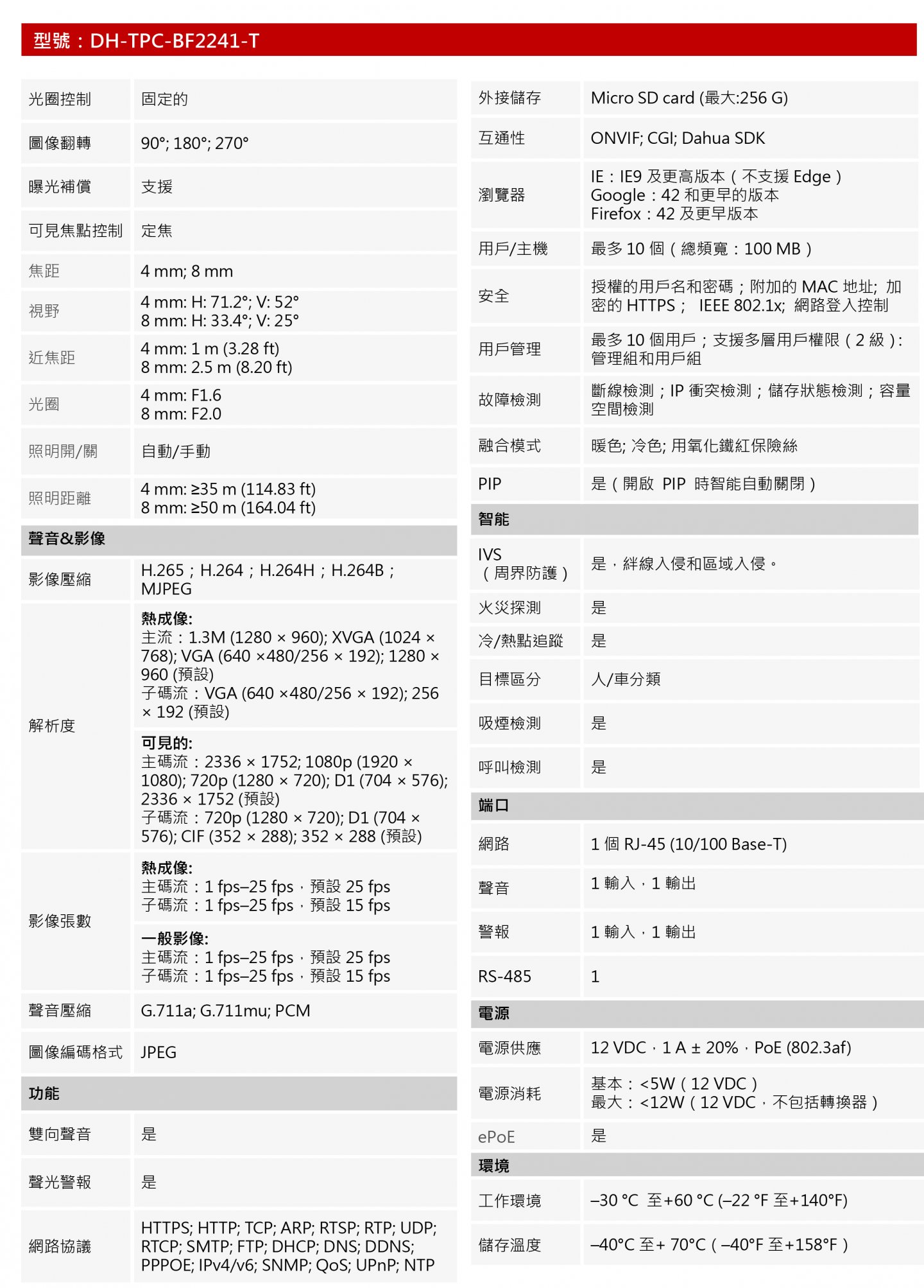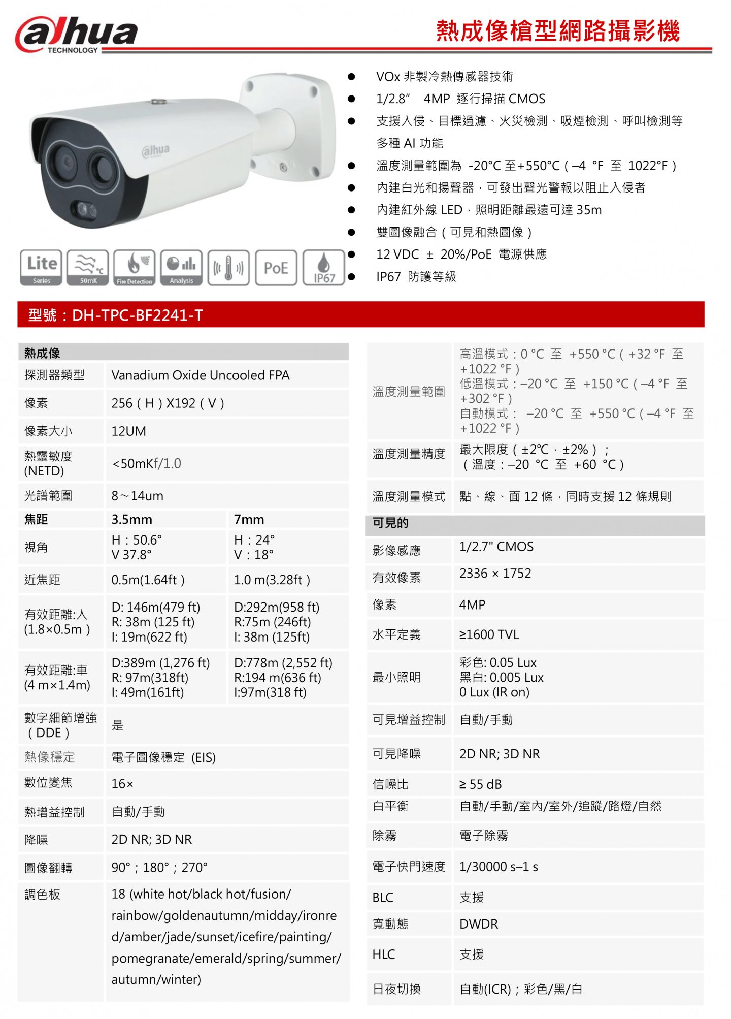▶VOx非製冷熱傳感器技術 ▶1/2.8” 4MP 逐行掃描CMOS ▶支援入侵、目標過濾、火災檢測、吸煙檢測、呼叫檢測等多種AI功能 ▶溫度測量範圍為 -20°C至+550°C(–4 °F 至 1022°F) ▶內建白光和揚聲器,可發出聲光警報以阻止入侵者 ▶內建紅外線LED,照明距離最遠可達35m ▶雙圖像融合(可見和熱圖像) ▶12 VDC ± 20%/PoE 電源供應 ▶IP67 防護等級