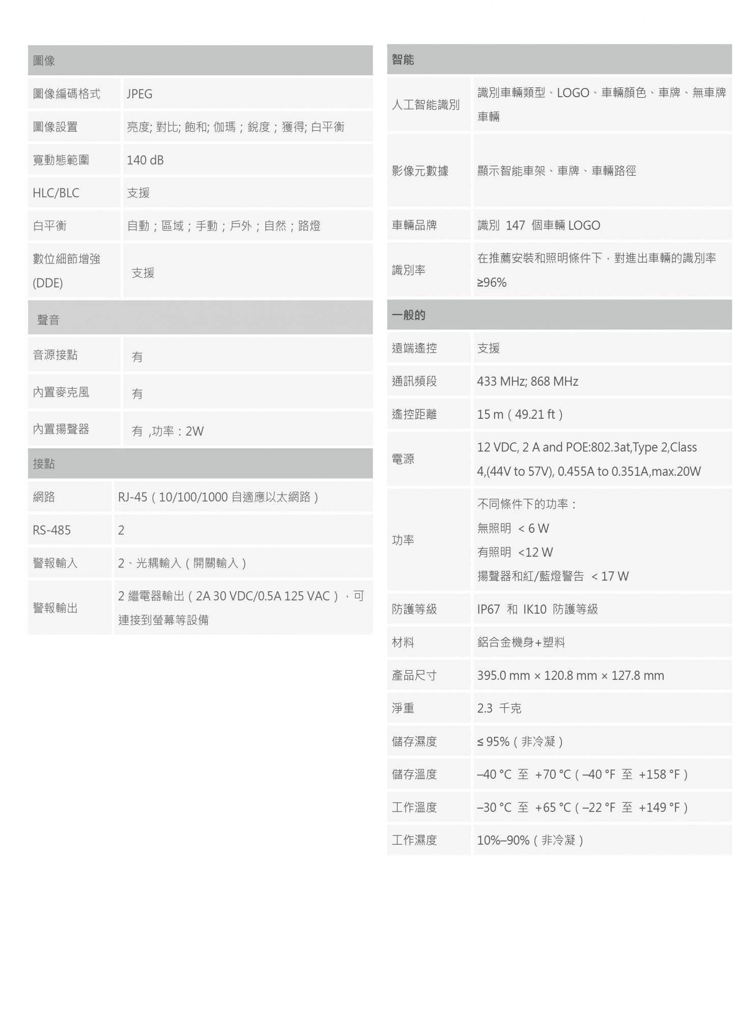 高性能 CMOS 圖像傳感器和處理器,支持24/7 持續提取元數據採用智能深度學習算法,支持識別、無牌車輛的數量以及車輛的類型、品牌和顏色