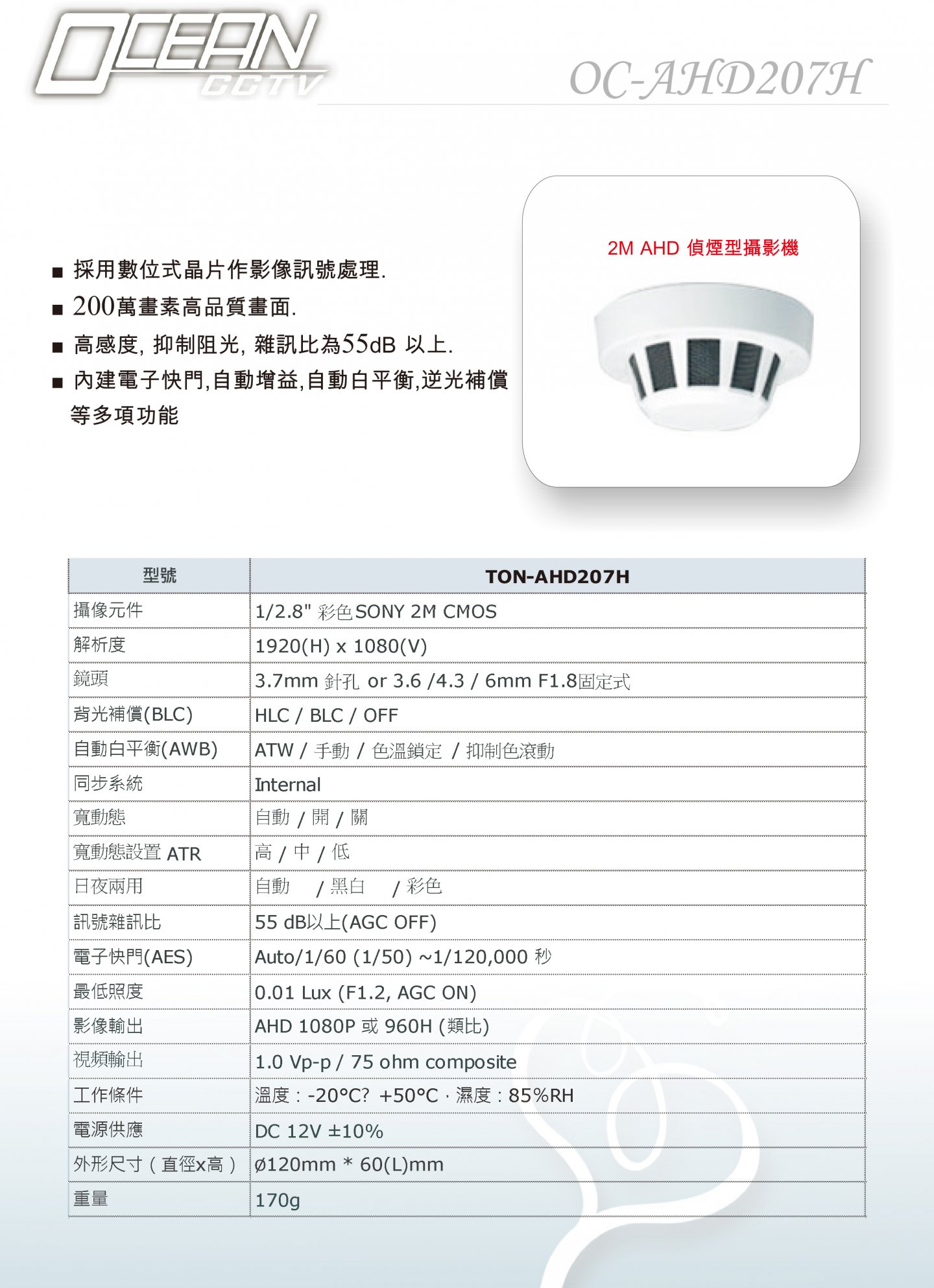 OC-AHD207H 2MP AHD偵煙型攝影機