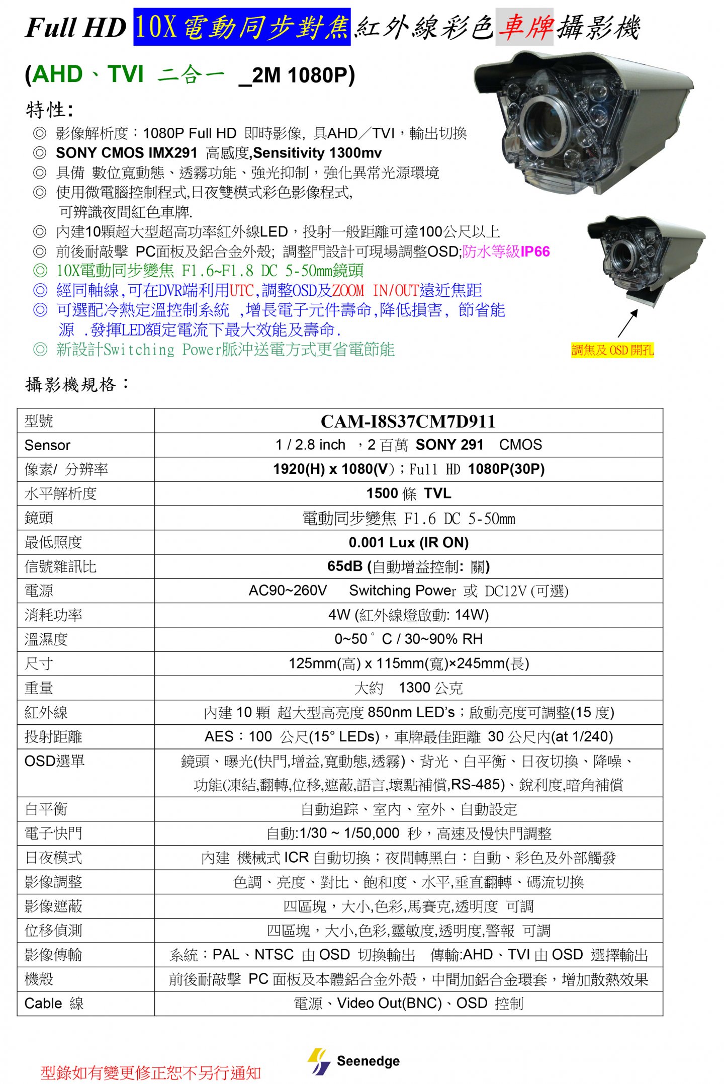 ◎ 影像解析度:1080P Full HD 即時影像, 具AHD/TVI,輸出切換