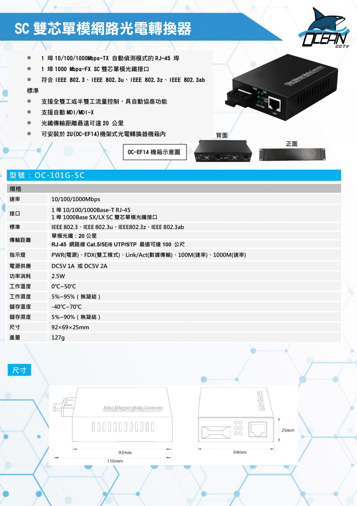 ▶ 可安裝於2U(OC-EF14)機架式光電轉換器機箱內