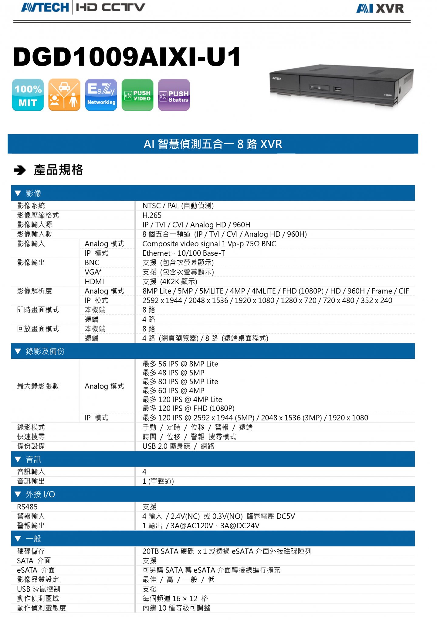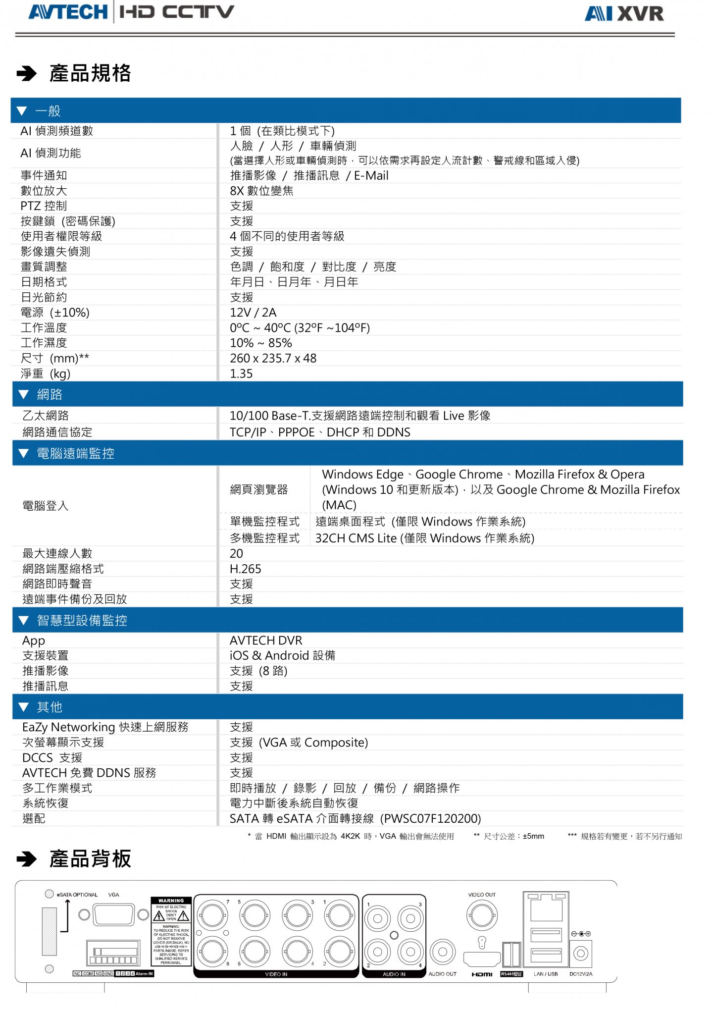 影像系統 NTSC / PAL (自動偵測) 影像壓縮格式 H.265 影像輸入源 IP / TVI / CVI / Analog HD / 960H 警報輸入 4 輸入 / 2.4V(NC) 或 0.3V(NO) 臨界電壓 DC5V 警報輸出 1 輸出 / 3A@AC120V、3A@DC24V