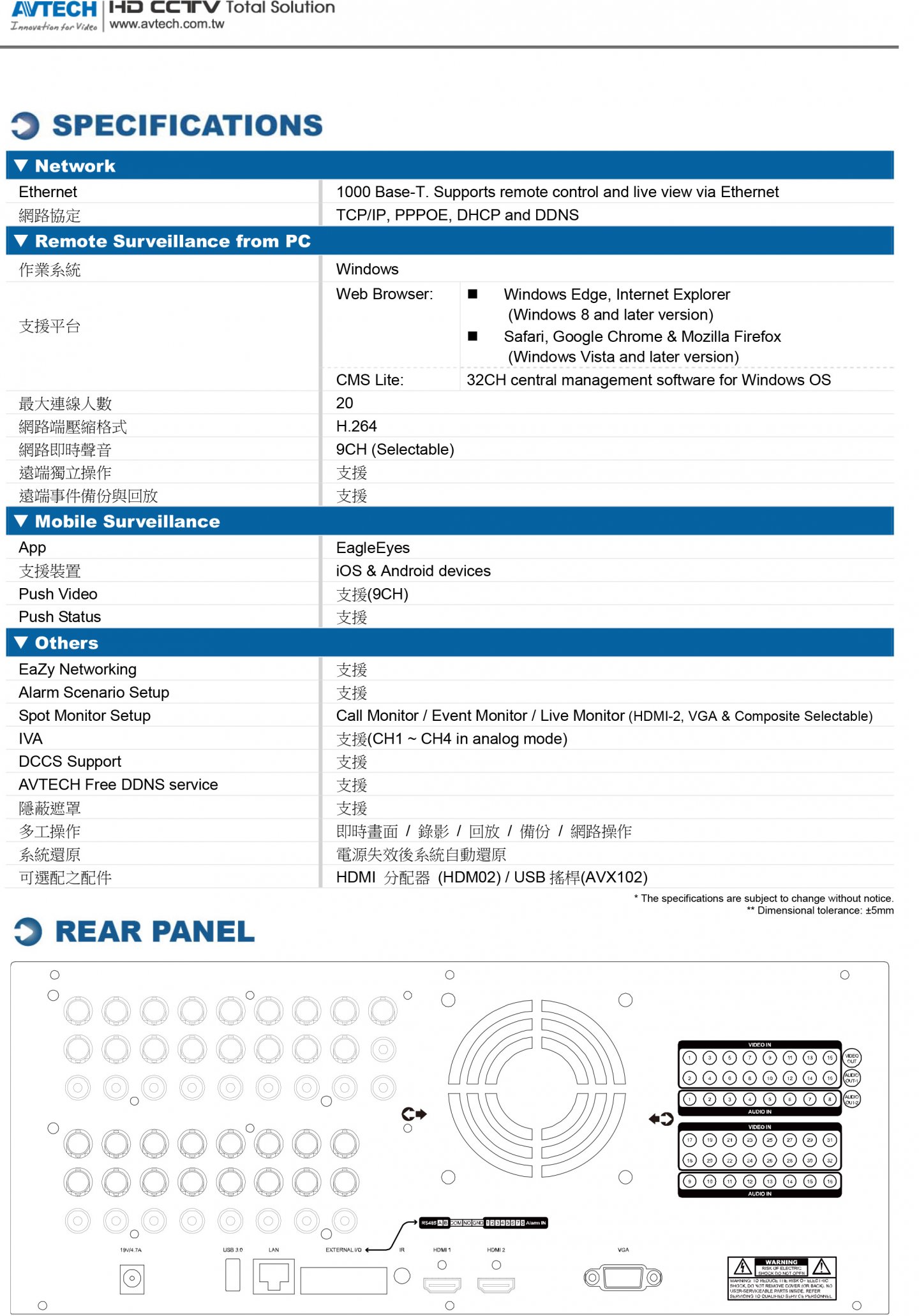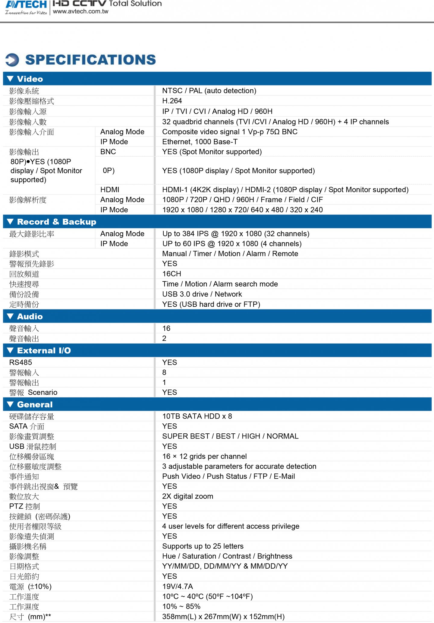 影像輸入數 32 quadbrid channels (TVI /CVI / Analog HD / 960H) + 4 IP channels