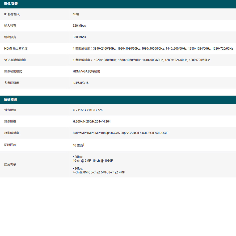 最高支援 10通道 @ 3MP (25fps) / 16 通道 @ 1080P (25fps) 解碼能力