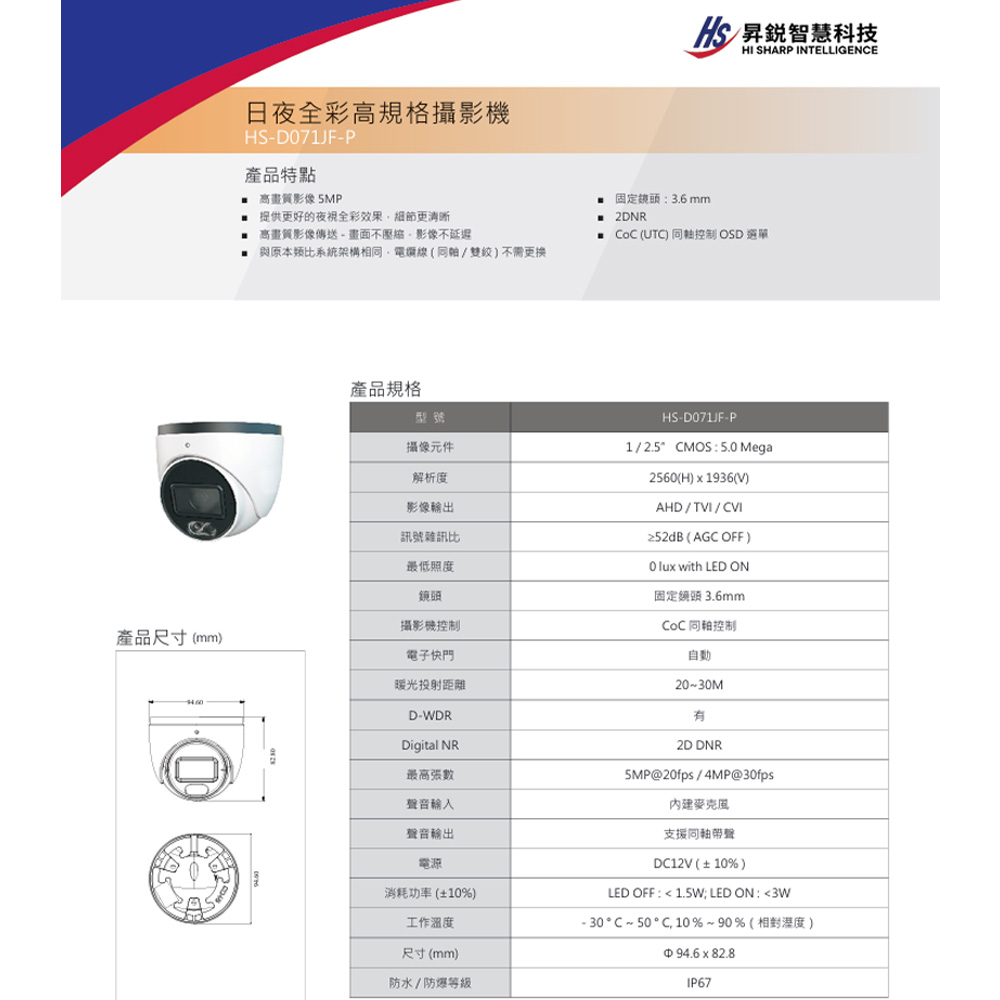 昇銳 HS-D071JF-P 5百萬暖光全彩槍型類比攝影機