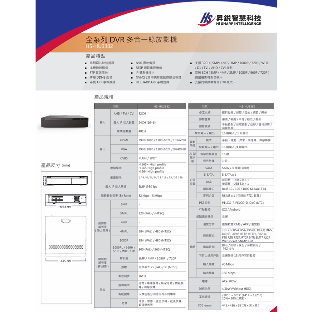 支援 32CH ( 5MP/ 4MP / 3MP / 1080P / 720P / WD1/ D1 ) TVI / AHD / CVI 類比攝影機影像輸入