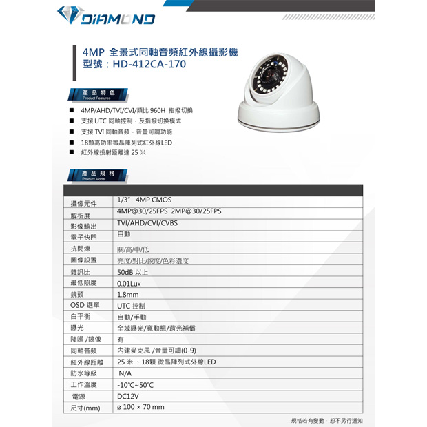 HD-412CA-170 4MP 全景式同軸音頻紅外線攝影機