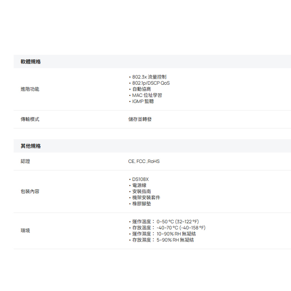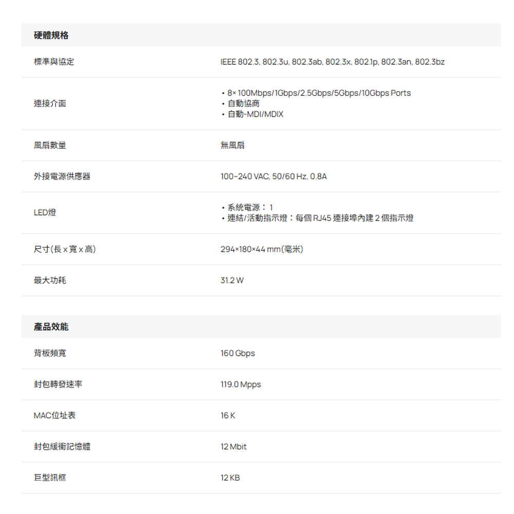 8 個 10 Gbps 連接埠:8 個 10-Gigabit 連接埠可發揮 10G/Multi-Gig 頻寬與設備的最高效能,並提供高達 160 Gbps 的交換容量。