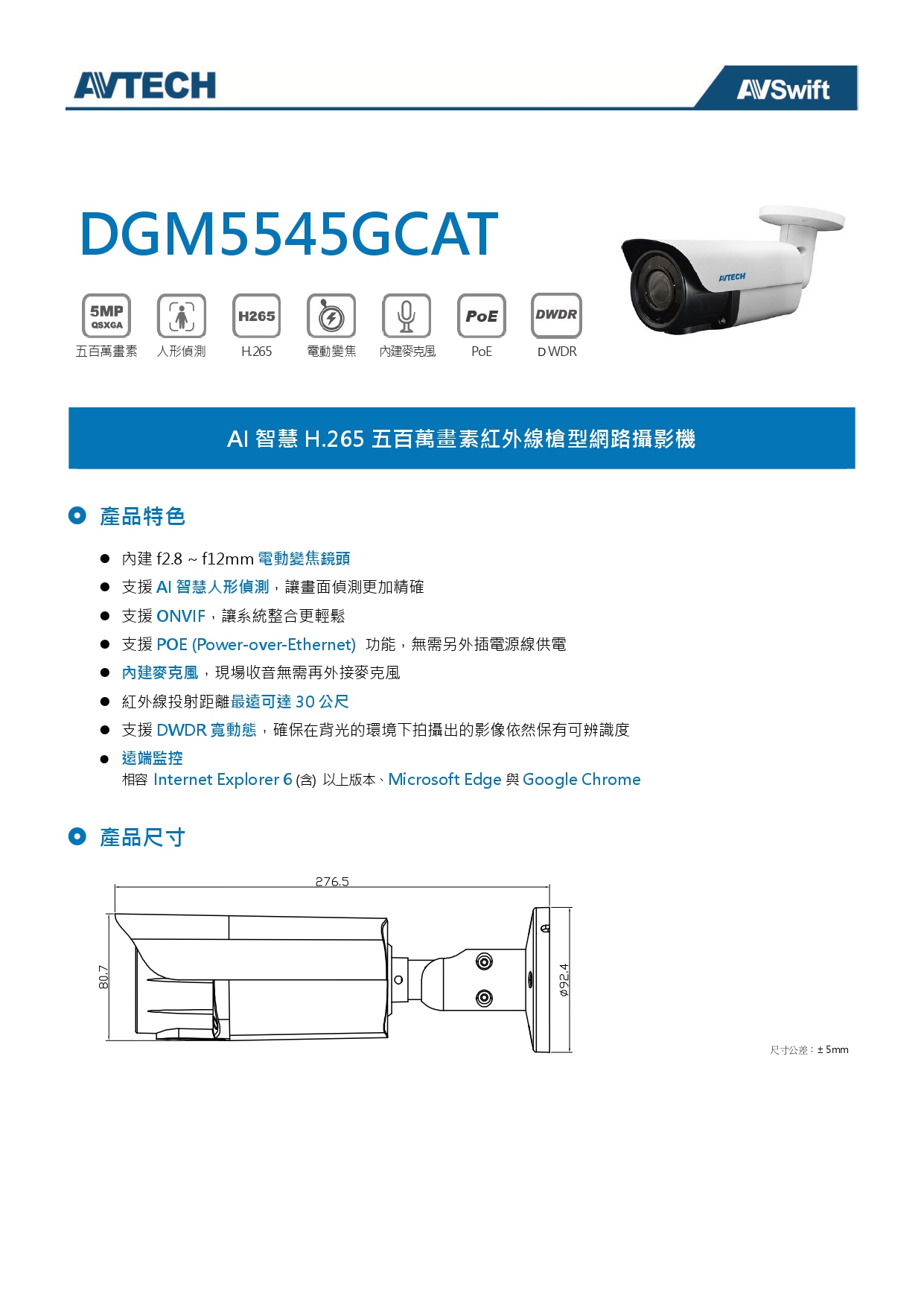 AVTECH 陞泰 DGM5545GCAT 五百萬畫素 AI智慧 H.265 紅外線槍型 網路攝影機