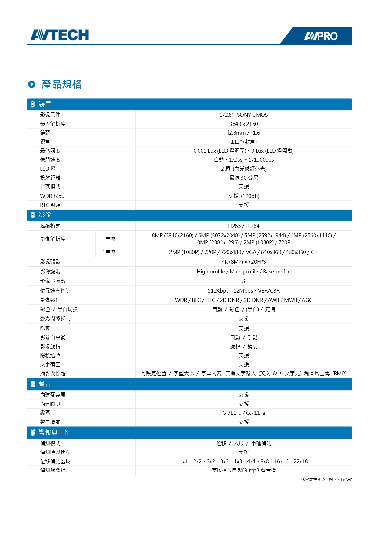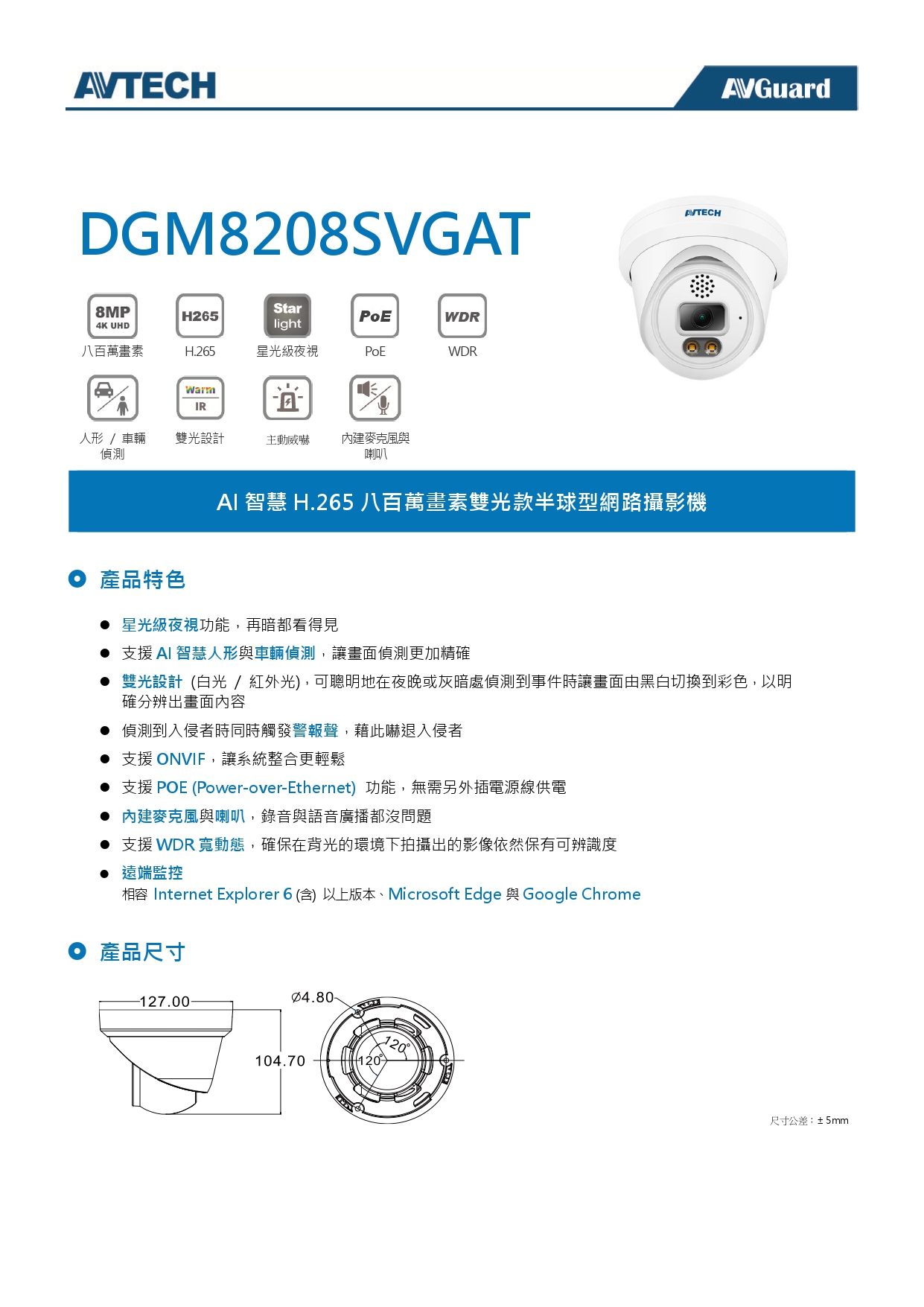 AVTECH 陞泰 DGM8208SVGAT 八百萬畫素 AI智慧 H.265 雙光款半球型 網路攝影機