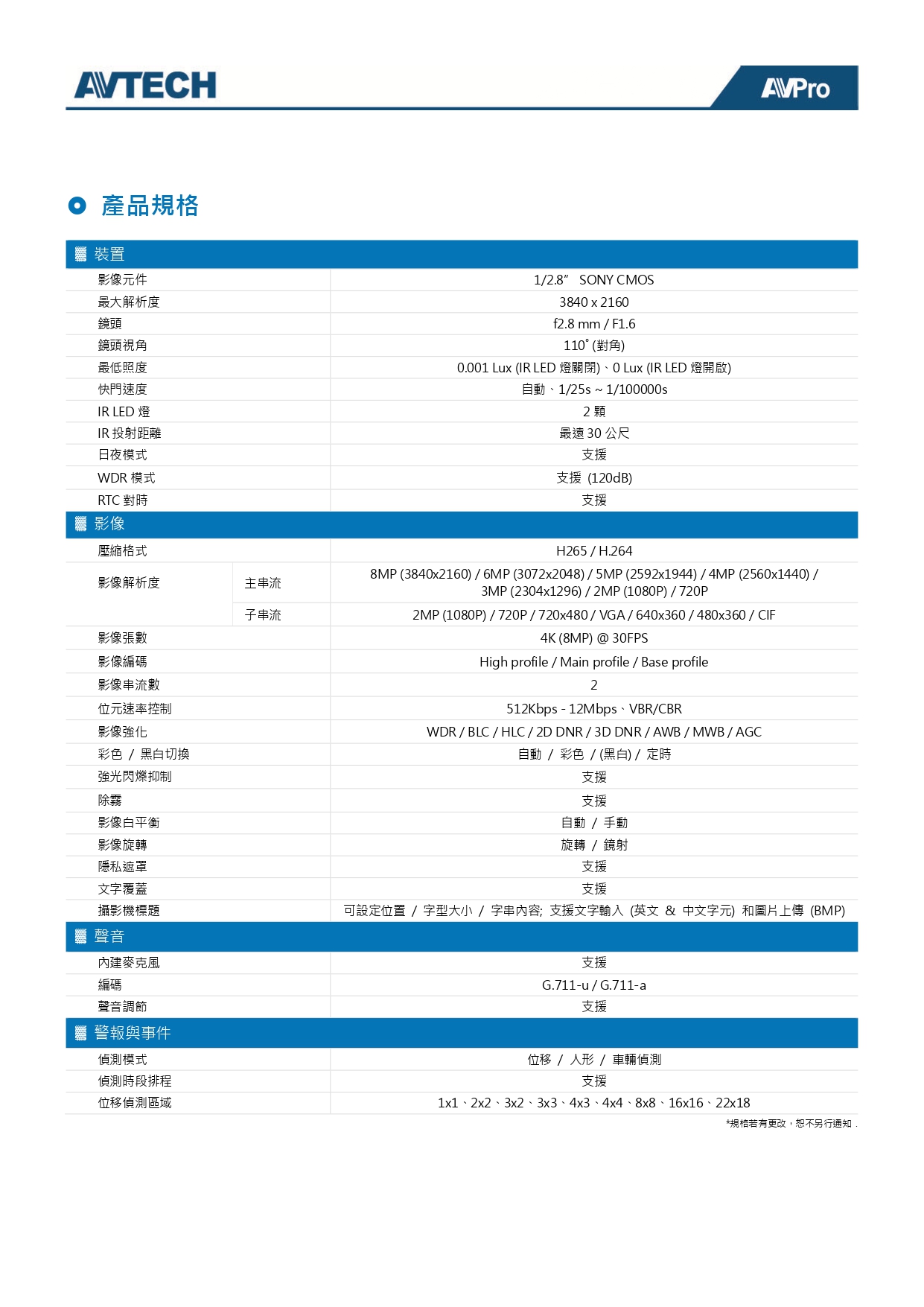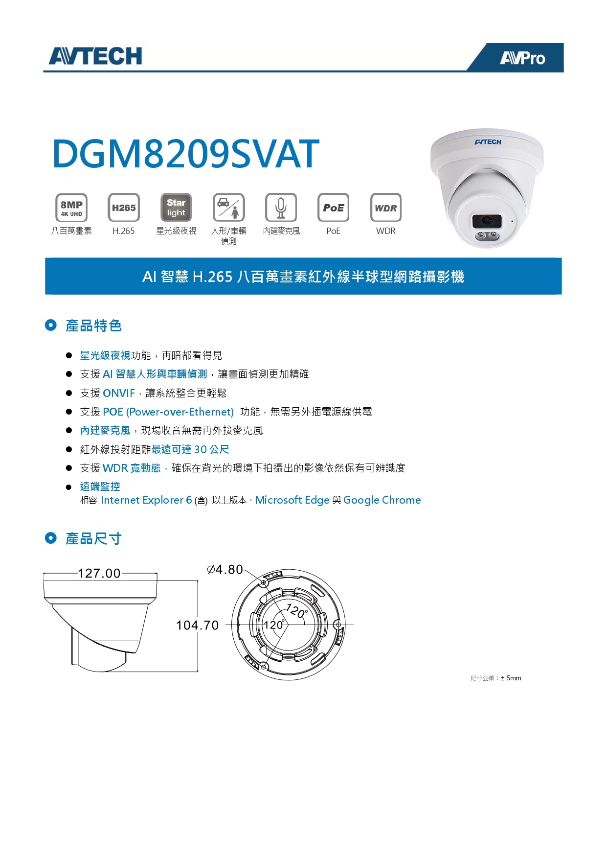 AVTECH 陞泰 DGM8209SVAT 八百萬畫素 AI智慧 H.265 紅外線半球型 網路攝影機