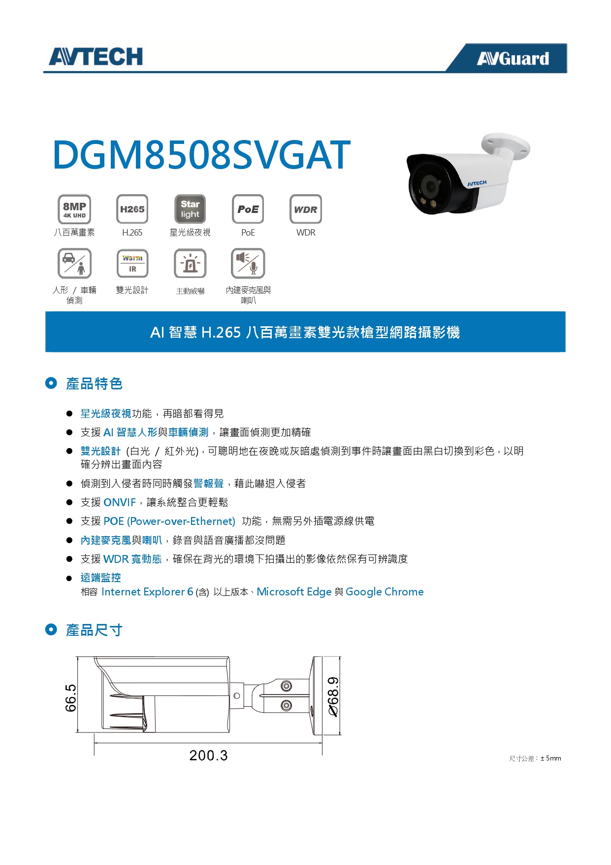 AVTECH 陞泰 DGM8508SVGAT 八百萬畫素 AI智慧 H.265 雙光款槍型 網路攝影機