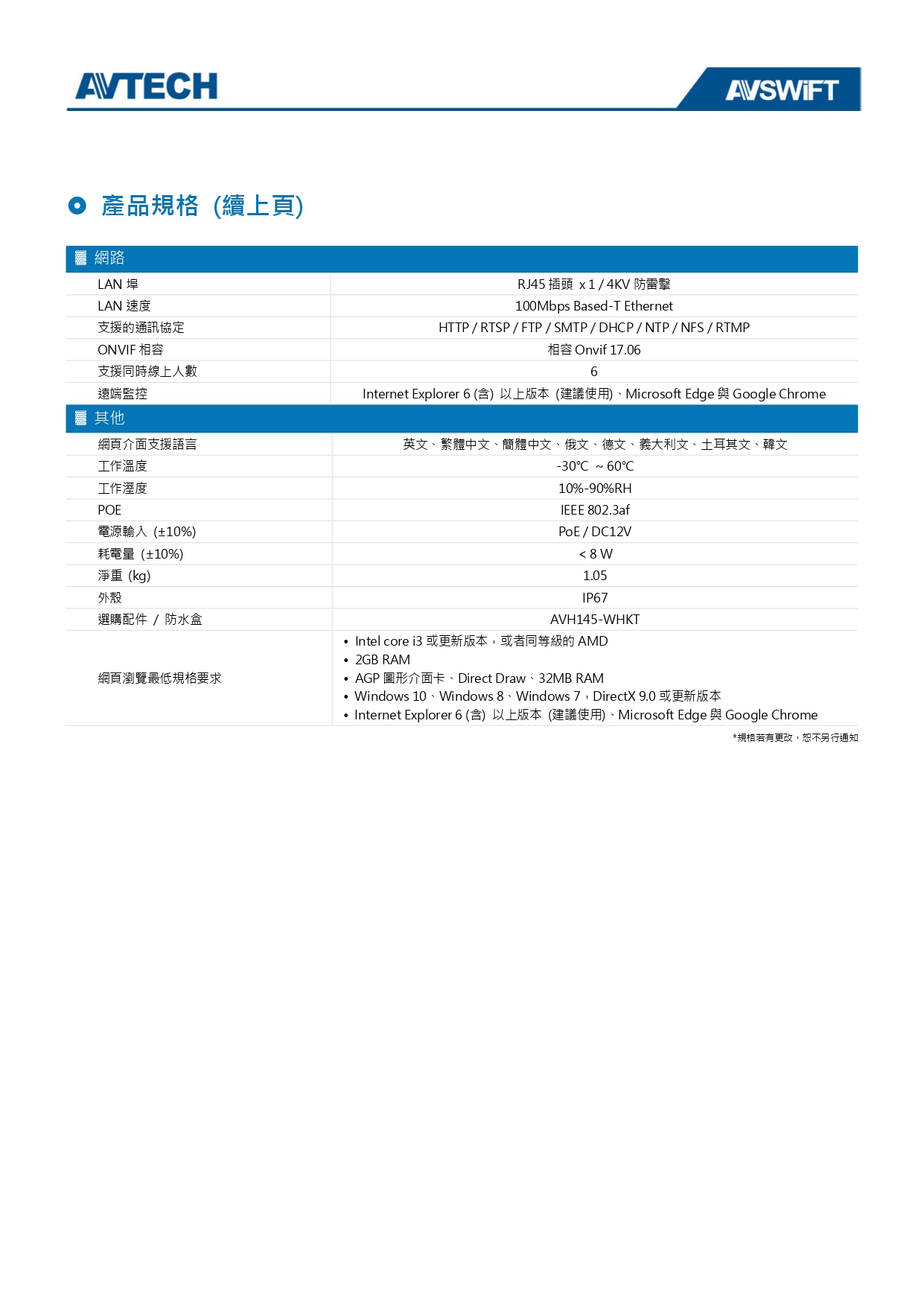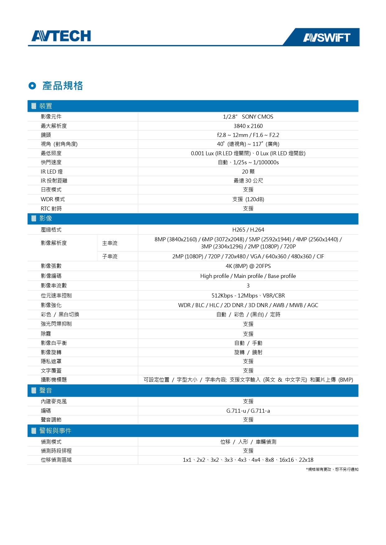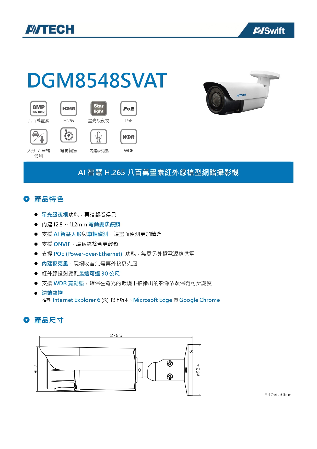 AVTECH 陞泰 DGM8548SVAT 八百萬畫素 AI智慧 H.265 紅外線槍型 網路攝影機