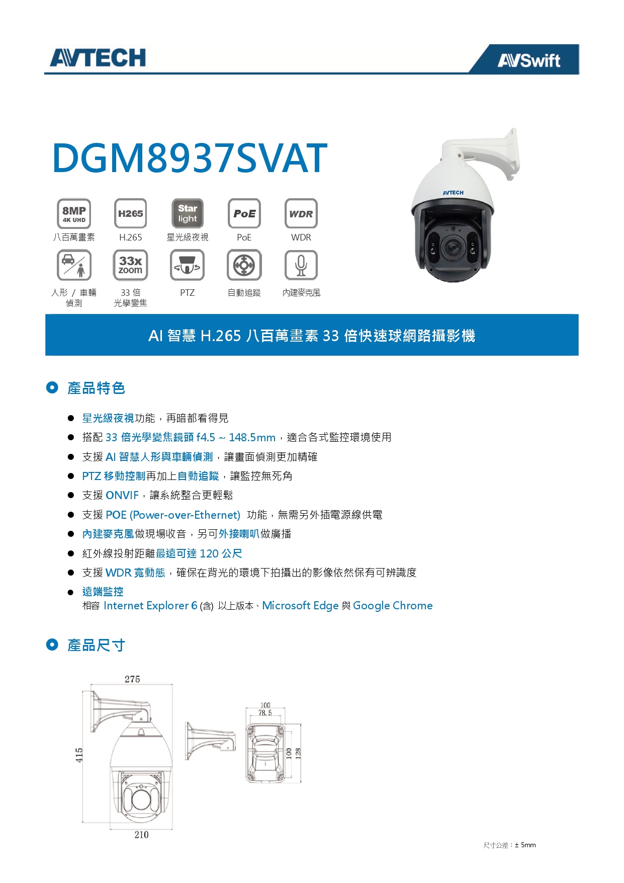 AVTECH 陞泰 DGM8937SVAT 八百萬畫素 AI智慧 H.265 33倍快速球 網路攝影機