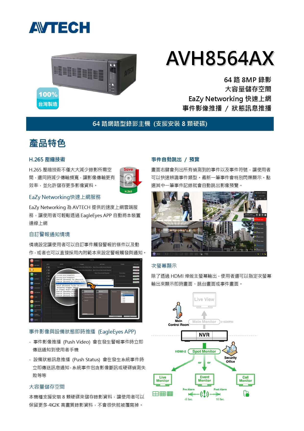 AVTECH 陞泰 AVH8564AX 64路 網路型錄影主機 支援安裝 8 顆硬碟