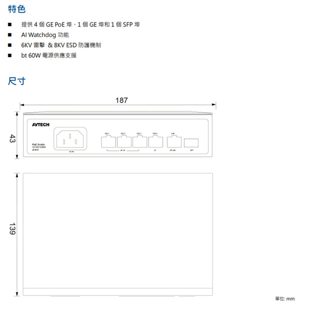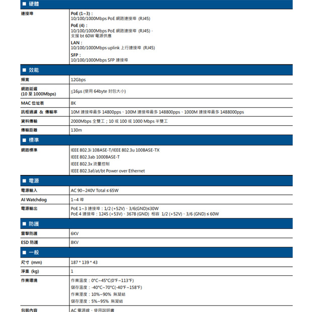提供 4 個 GE PoE 埠、1 個 GE 埠和 1 個 SFP 埠