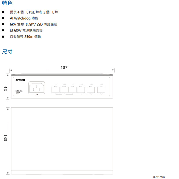 AVTECH 陞泰 DGS4200PE 4xFE PoE+2xFE PoE網路交換機