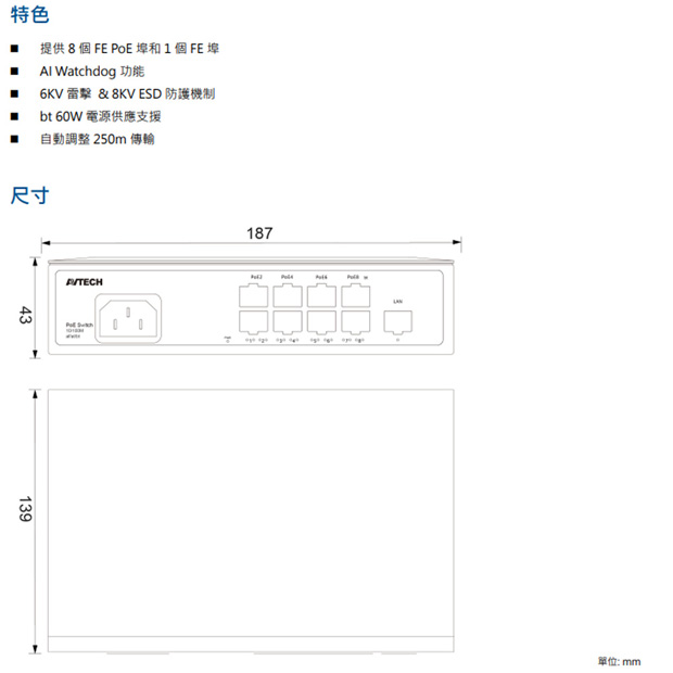 AVTECH 陞泰 DGS8100PE 8xFE PoE+1xFE PoE網路交換機