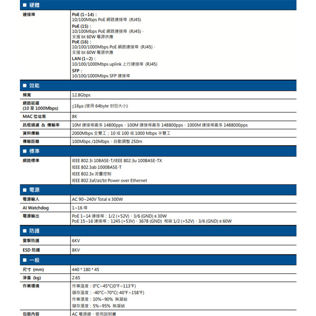 提供 15 個 FE PoE 埠、1 個 GE PoE 埠、2 個 GE 埠和 1 個 SFP 埠
