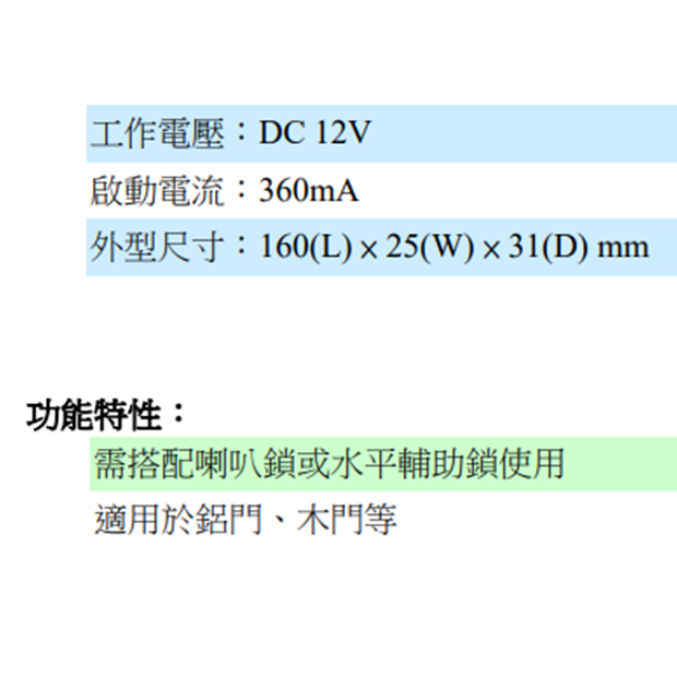 特別適用鋁門、木門等.需搭配喇叭鎖或機械輔助鎖使用。