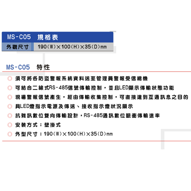 可結合二線式RS-485信號傳輸控制,並且LED顯示傳輸狀態功能