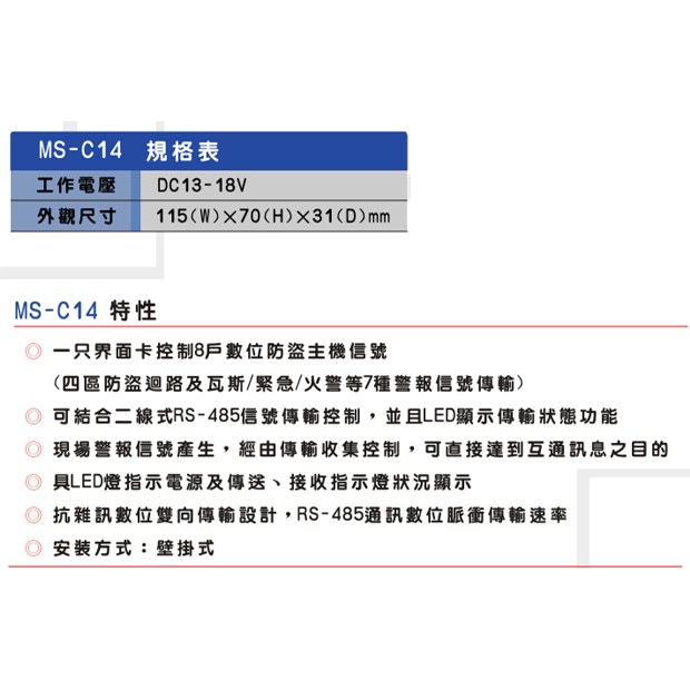 (四區防盜迴路及瓦斯/緊急/火警等7種警報信號傳輸)
