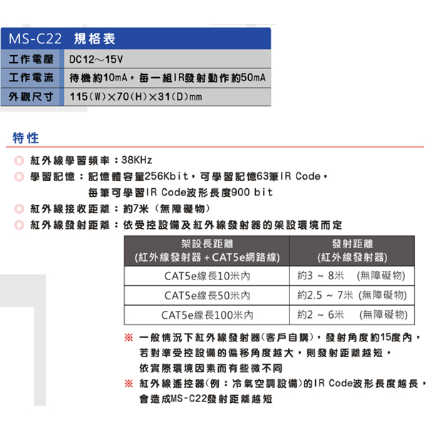 紅外線發射距離:依受控設備及紅外線發射器的架設環境而定