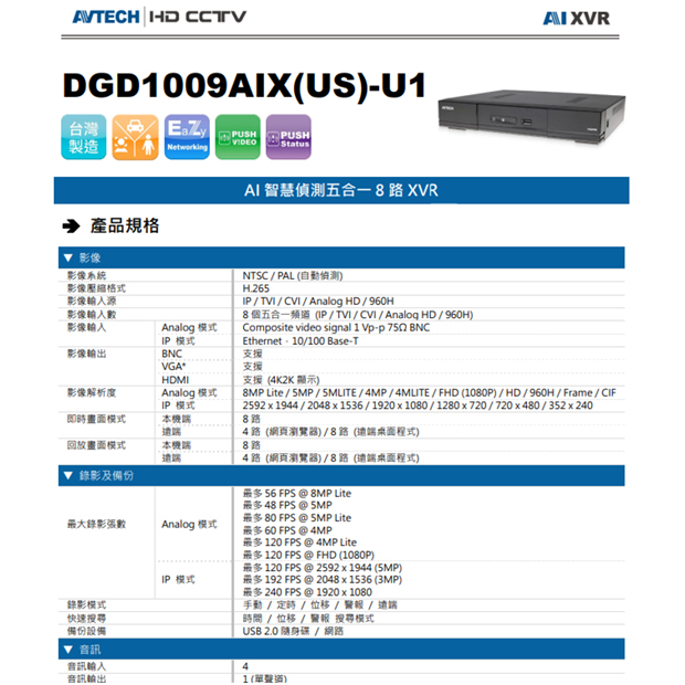 數位訊號模式: 8MP Lite / 5MP / 5MLITE / 4MP / 4MLITE / FHD (1080P) / HD / 960H / Frame / CIF
