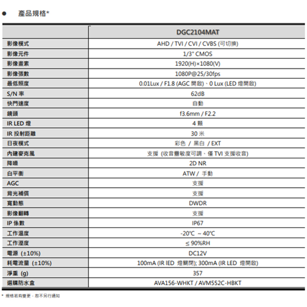 AVTECH 陞泰 DGC2104MAT 2MP 4合1 紅外線槍型攝影機