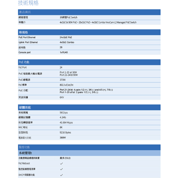 VIVOTEK AW-GEV-288A-370 28 埠 VIVOCAM L2 管理型 PoE 交換器