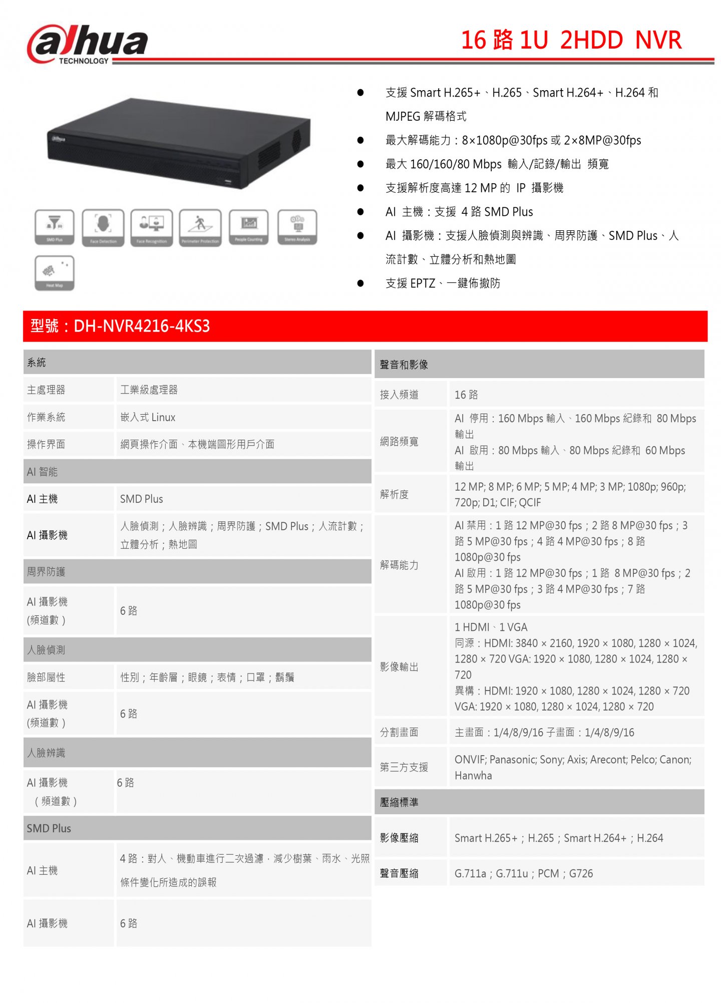 ⚫ AI 攝影機:支援人臉偵測與辨識、周界防護、SMD Plus、人流計數、立體分析和熱地圖