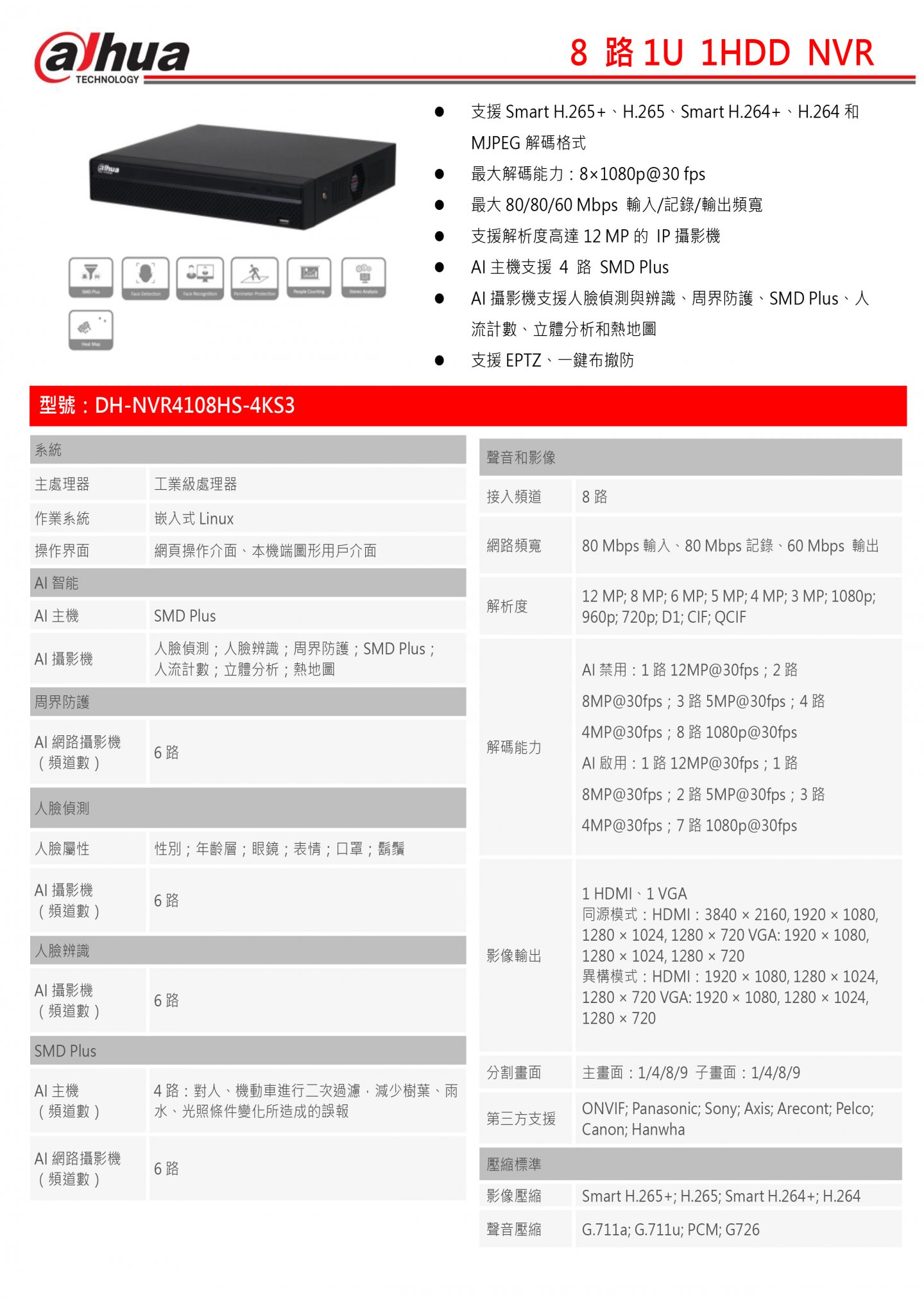 ⚫ AI攝影機支援人臉偵測與辨識、周界防護、SMD Plus、人流計數、立體分析和熱地圖