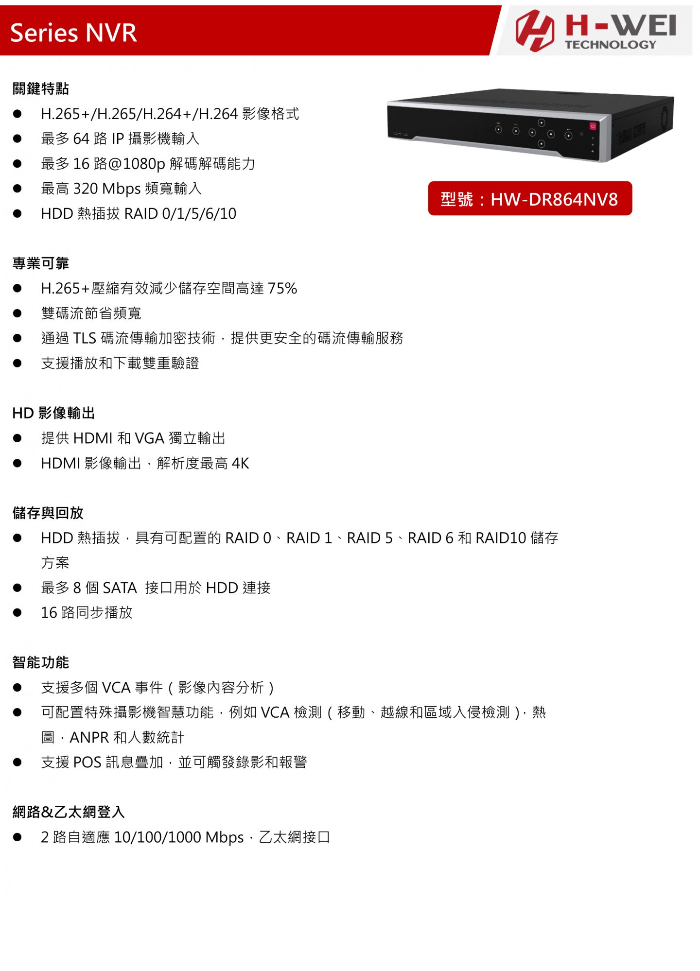 HW-DR864NV8 64路2U 4K NVR