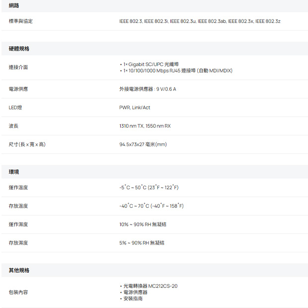 TP-LINK MC212CS-20 Omada Gigabit WDM 光電轉換器(單模單芯)