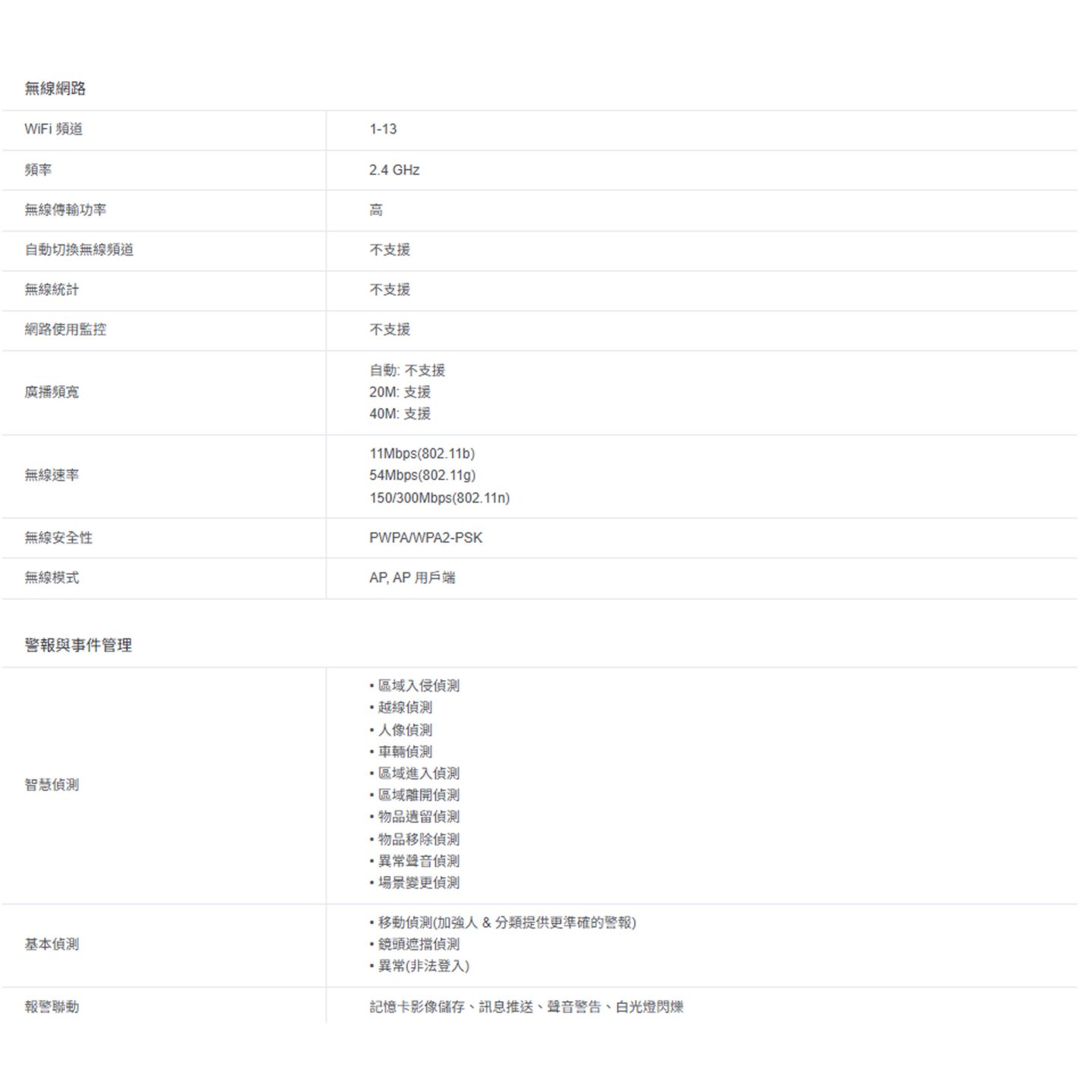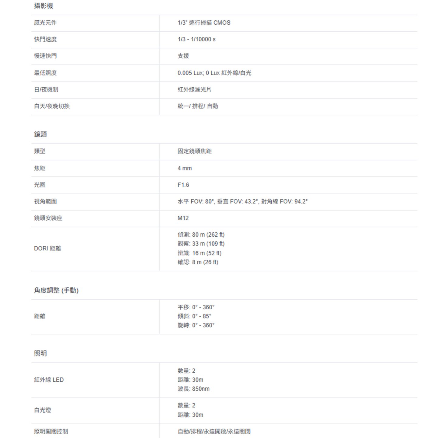 24h 全彩畫面: 就算在漆黑的環境中,透過高靈敏度感應器和內建的補光燈,也能取得 24 小時全彩細節