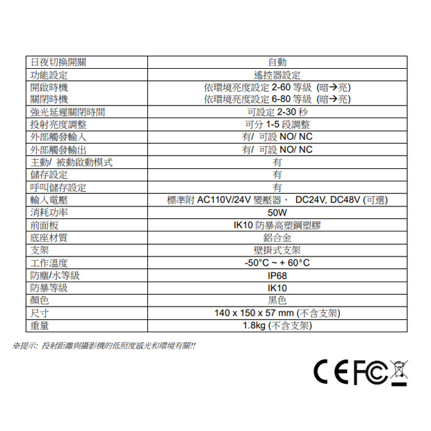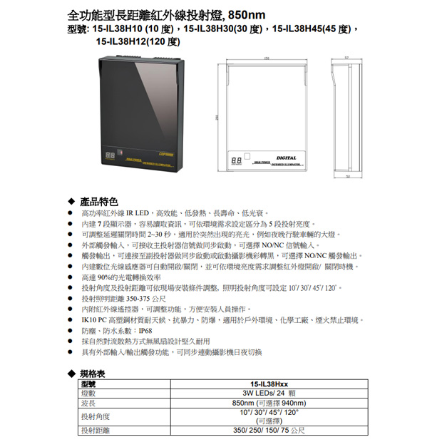 投射角度及投射距離可依現場安裝條件調整, 照明投射角度可設定10°/ 30°/ 45°/ 120°。